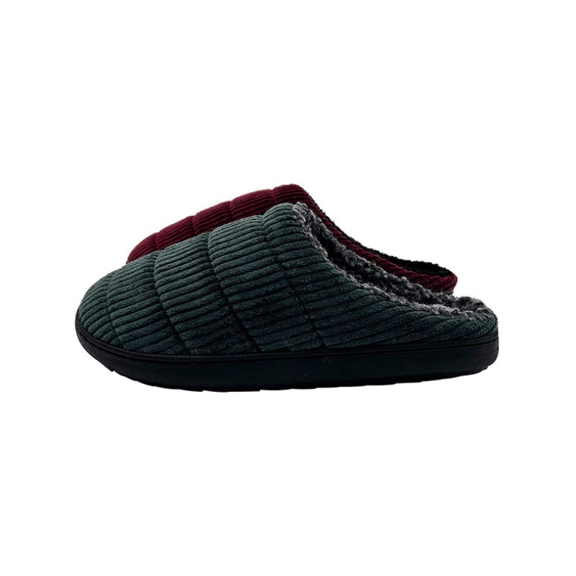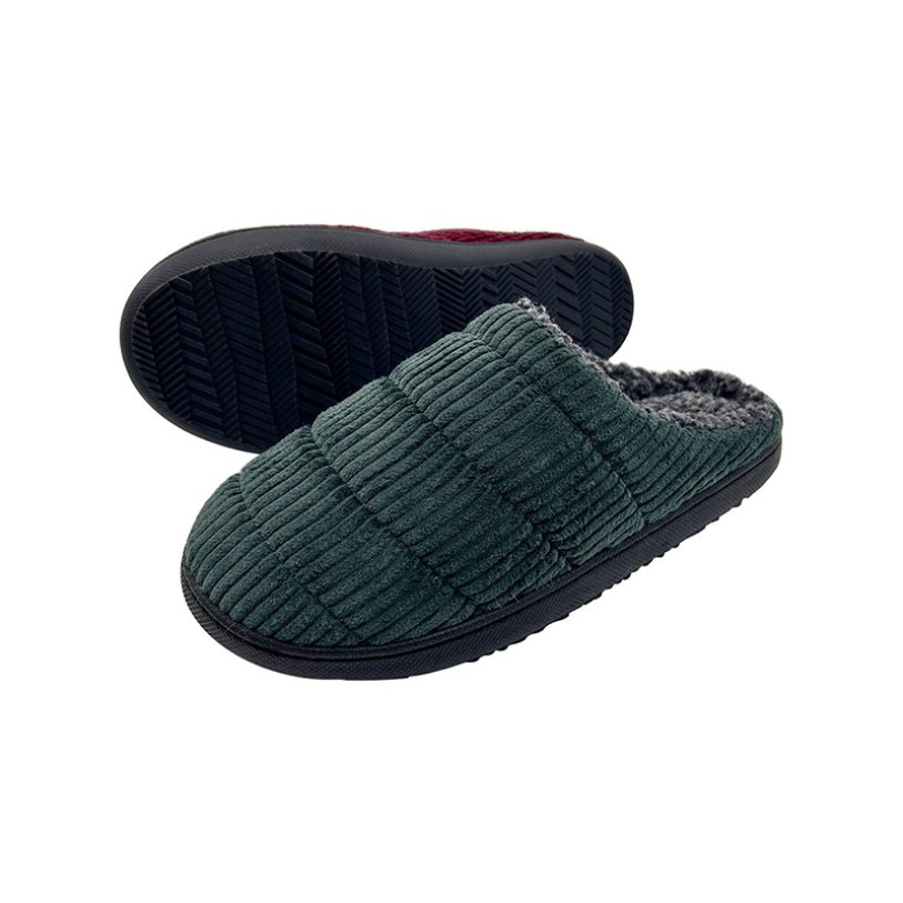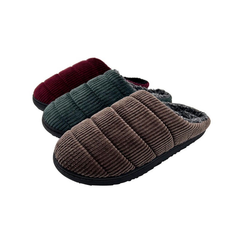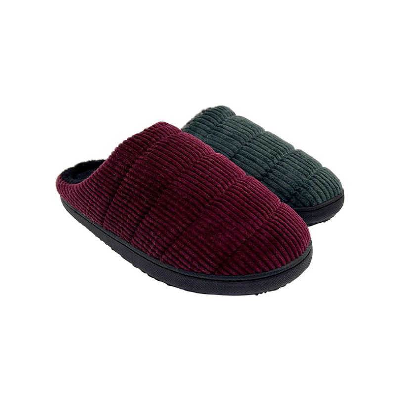 These slippers feature a mule design suitable for both indoor and outdoor wear, combining comfort with warmth. The upper is crafted from soft corduroy fabric with a smooth texture, offering durability and longevity. The lining and midsole utilize high-quality Berber wool to enhance insulation while ensuring excellent breathability. A memory foam insole provides cushioning support, reducing foot pressure and enhancing comfort during extended wear. The durable TPR slip-resistant outsole ensures stability and safety even on smooth surfaces. The overall design is substantial and sturdy, balancing casual style with warmth.