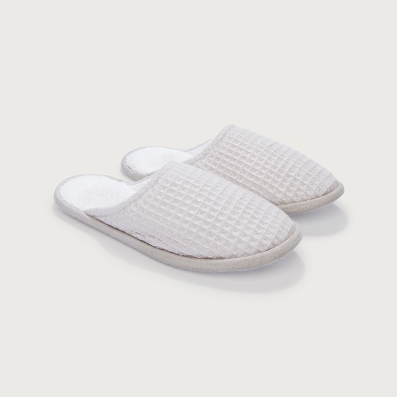 This shoe features an open-toe mule design for easy slip-on and off while maintaining excellent breathability. The upper showcases a waffle-textured pattern that is both stylish and visually appealing, enhancing overall comfort. The midsole and lining utilize soft terry cloth material, combined with a memory foam insole, providing moderate cushioning and rebound to reduce foot pressure. This ensures long-lasting comfort even during extended periods of walking around the home. The lightweight, supple construction is complemented by a TPR outsole that offers slip resistance and durability, ensuring safe and stable indoor mobility.