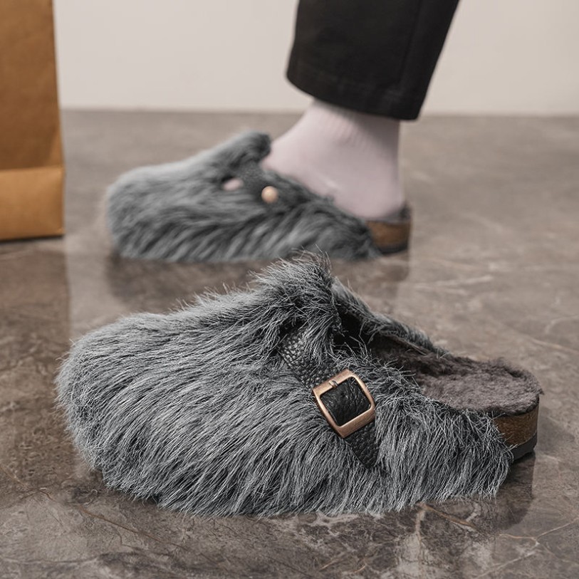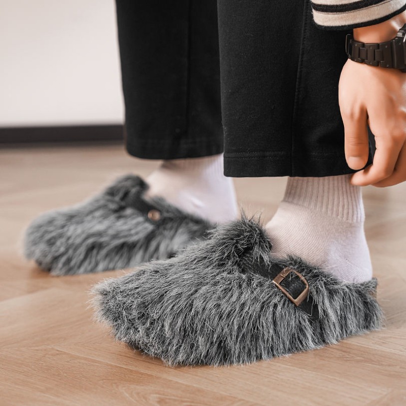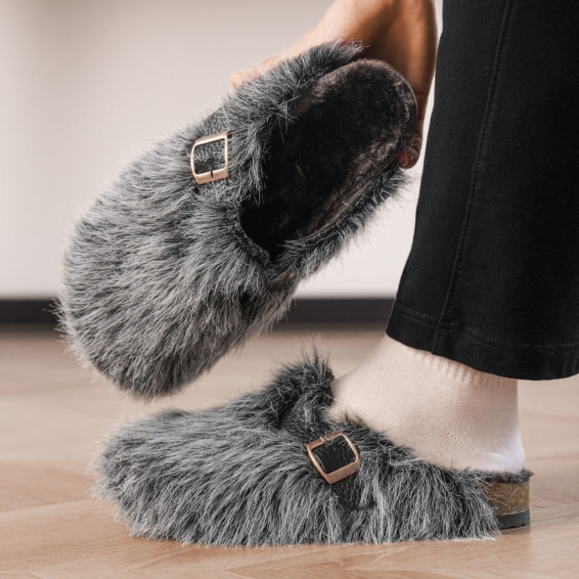 This shoe combines comfort with stylish design, featuring a rounded toe and closed-toe silhouette ideal for everyday home wear or casual outings. The upper is crafted from plush fur material that is soft and warm, enhancing the wearing experience while offering lightweight, heat-treated, and water-resistant properties. The outsole utilizes TPR material for slip resistance and durability, ensuring safe walking. The EVA midsole provides cushioning and moderate height lift, reducing foot pressure. The breathable mesh lining enhances airflow inside the shoe, keeping feet dry and comfortable. The buckle closure allows for adjustable fit, presenting an overall sporty and trendy aesthetic.