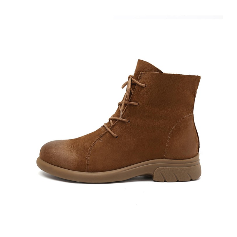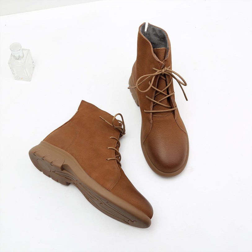 Crafted from premium cowhide leather, these boots feature a smooth, refined surface that's supple yet durable, delivering exceptional comfort. The ankle-high boot design with a rounded toe fits the foot naturally, making them ideal for everyday wear and outdoor adventures. A soft faux fur lining provides excellent insulation, keeping feet warm even in cold conditions. The thick sole, approximately 3.5 cm high, provides height enhancement while cushioning walking pressure. The rubber outsole is wear-resistant and slip-resistant, adapting to various terrains for secure footing. The lace-up opening allows for adjustable tightness, facilitating easy on/off and enhancing fit.