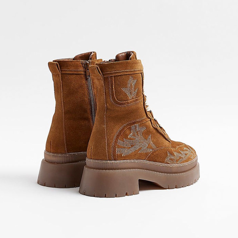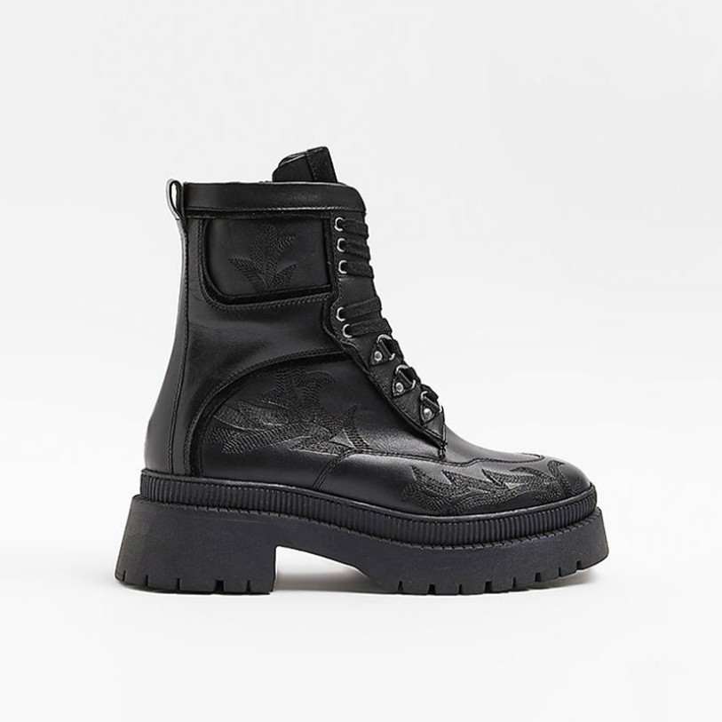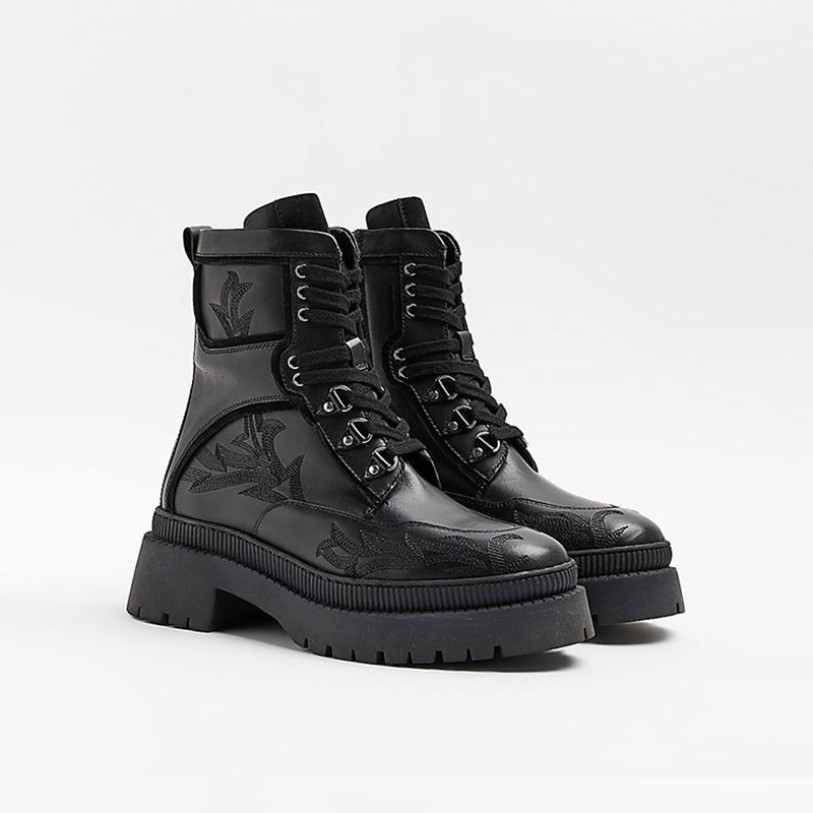 This shoe features an exquisitely embroidered genuine leather upper paired with a square heel design, blending fashion-forward style with stability. The calf-length boot shaft flatters the leg line while providing comfortable support. The lace-up opening allows for adjustable fit, ensuring a secure hold and easy on/off. The breathable, durable upper suits daily commutes, casual outings, or pairing with dresses, balancing aesthetics and functionality. The rubber outsole offers slip resistance and durability, while the PU midsole and lining enhance cushioning and comfort. The overall design blends European and American biker aesthetics with urban fashion elements, making it versatile for various occasions.