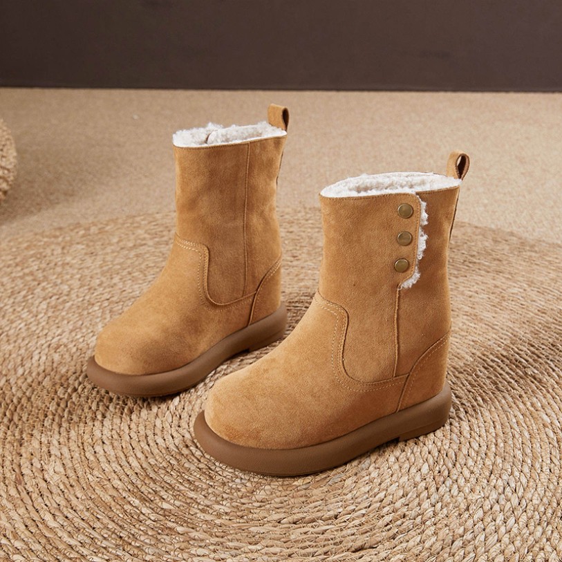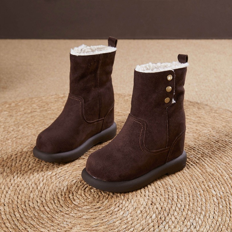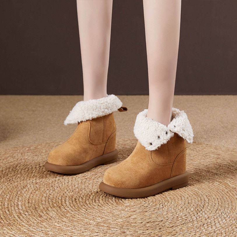 This shoe features a genuine leather and premium synthetic leather upper with a thickened plush lining for warmth and comfort, ideal for winter and cold environments. The approximately 10cm thick sole provides noticeable height enhancement, while the soft cushioning midsole ensures lightweight, fatigue-free walking. The outsole combines PU, rubber, and rubberized fabric for slip resistance and durability, offering shock absorption and waterproofing to ensure safe outdoor walking. Available in round-toe, square-toe, or pointed-toe styles, the closed-toe design hugs the foot for superior warmth retention. Balancing fashion-forward style with practicality, these lightweight, breathable boots resist odor and microbial growth, making them perfect for everyday autumn and winter wear.