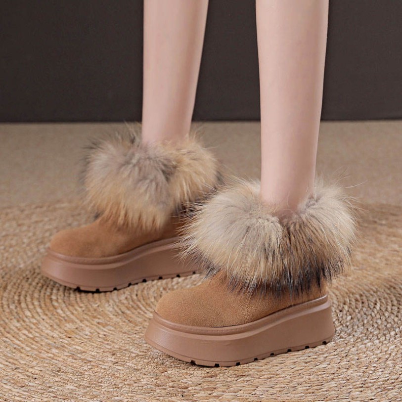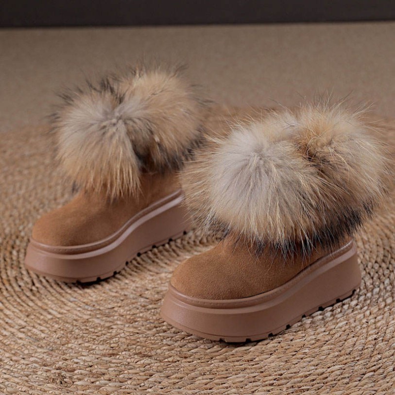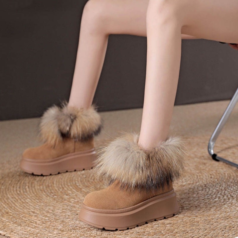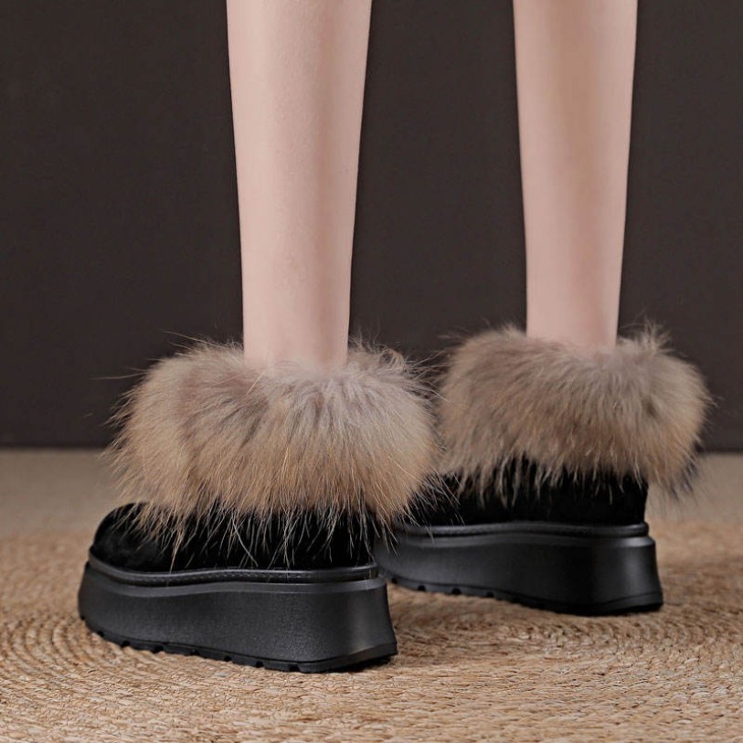 This shoe is designed for women, featuring a suede upper that is soft to the touch yet durable. The interior is lined with thick, extra-long plush fleece for exceptional warmth, making it ideal for winter wear. The substantial PU midsole paired with a polyurethane outsole provides cushioning comfort while offering slip resistance and durability for stable walking. The ankle-length boot design features a rounded toe for comfortable foot contouring. Combining warmth with casual style, it suits both indoor and outdoor daily wear.