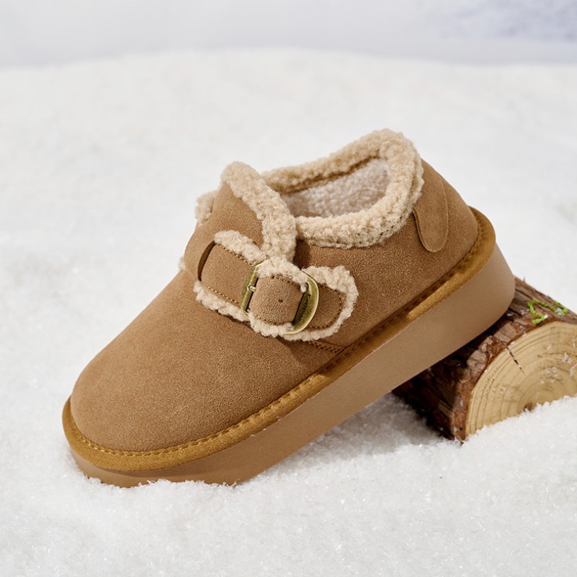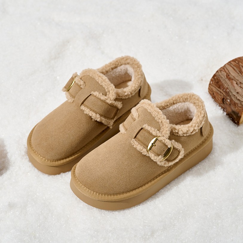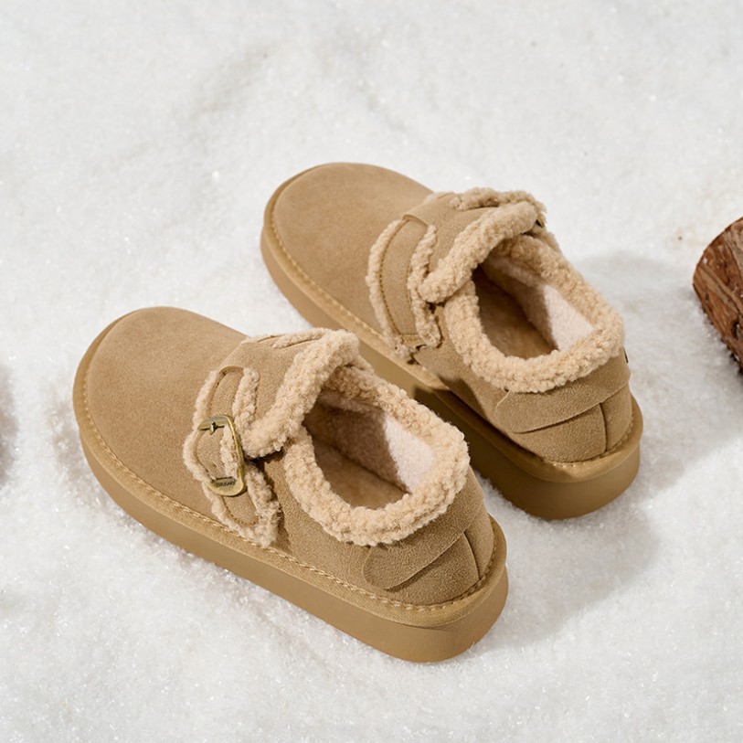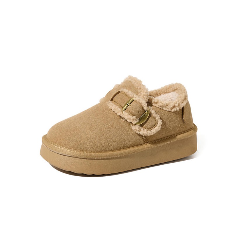 These shoes are specifically designed for winter warmth. The thick sole provides excellent cushioning and support, ensuring comfortable walking. The upper features soft faux suede material that is lightweight, durable, and breathable, combining style with practicality. The lining uses extra-long plush and fleece materials, offering soft warmth to keep feet cozy even in cold weather. The rounded toe design provides a relaxed fit for easy daily wear and removal. The TPR outsole provides slip resistance and durability, ensuring safe walking and making them suitable for various indoor and outdoor settings. The overall silhouette follows a minimalist Korean style, balancing comfort and fashion.