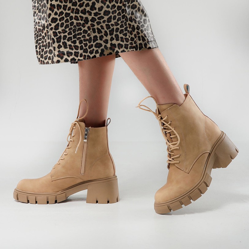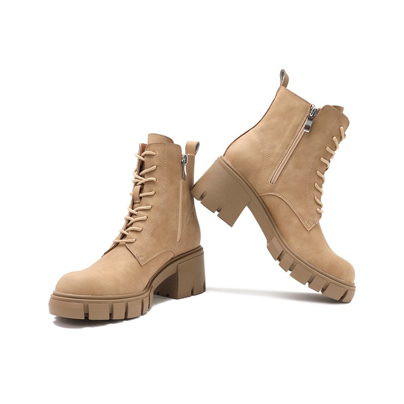 This shoe combines modern fashion with practical design, perfect for autumn and winter outfits. The ankle-high design wraps around the ankle while facilitating easy walking, creating a slender leg silhouette. The upper features soft PU material that feels comfortable to the touch, is easy to clean, and offers durability and wear resistance. The square heel and platform sole provide stable support, reducing pressure during extended walking or standing while offering noticeable height enhancement. The boot features a dual opening design with both a zipper and laces, allowing for easy on/off and adjustable tightness to suit different foot shapes, enhancing the snug fit. The rounded toe offers comfort and accommodates various foot types. The overall solid color design is simple and versatile, easily pairing with a wide range of outfits.