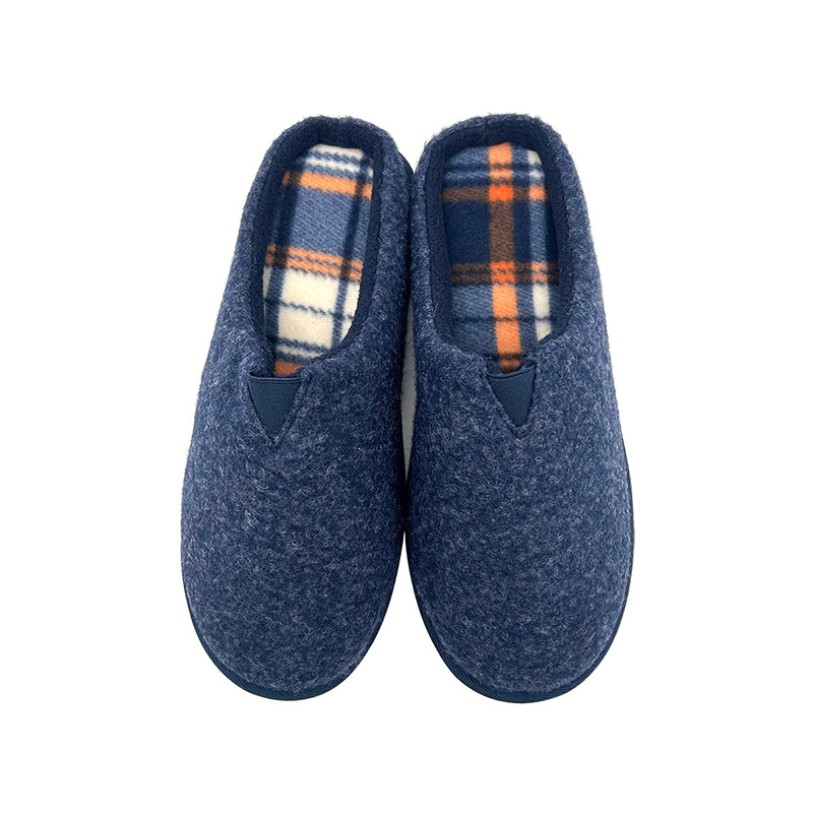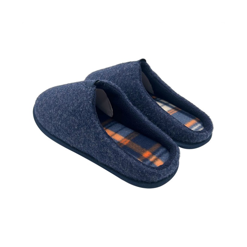 This shoe features a slip-on design for easy on-and-off wear. The V-neck elastic collar conforms to the foot shape, offering comfort and flexibility. The upper is crafted from felt material, which is soft, durable, and provides excellent warmth. The lining and midsole utilize plaid fabric, delivering a soft touch while offering extra cushioning and supportive comfort to effectively reduce walking fatigue. The closed toe box envelops the feet, combining warmth with support. The TPR outsole is lightweight, slip-resistant, and durable, ensuring safe indoor walking. The overall design combines comfort, durability, and minimalist aesthetics, making it ideal for winter home leisure wear.