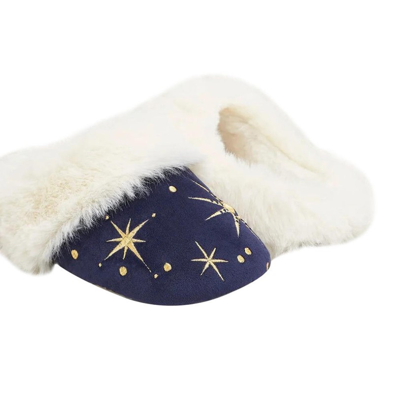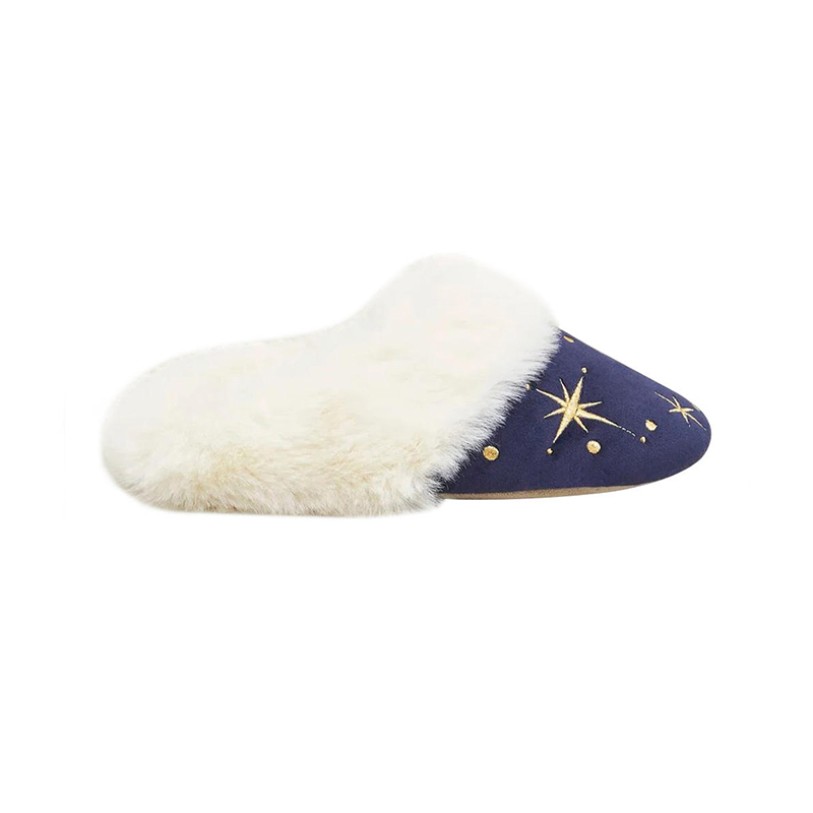 This slipper features a mule design with a closed toe that fully encloses the foot, providing excellent warmth for bedroom and everyday home wear. The upper is crafted from ultra-fine microfiber fabric with a soft, smooth texture, enhanced by unique embroidery detailing for an elevated aesthetic. Both the lining and midsole are generously padded with plush faux fur, offering comfort and cushioning while absorbing foot pressure. It also delivers superior breathability and a gentle feel. The lightweight construction, combined with heat-treated reinforcement, ensures structural stability and durability. The shoes offer quiet, slip-resistant walking, guaranteeing safety and comfort during home activities.